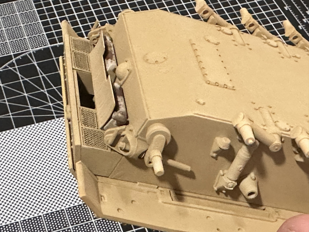 Moments like these are when I have been known to snatch defeat right out of the jaws of victory. But everything went to plan today, and the lower and upper hulls have been joined together. No Tamiya Extra-Thin related mishaps or incidents arose. I also got the spare tracks, and PE grills installed. I gave the metal parts an acid bath in white vinegar before I painted them, and it worked like a charm -paint’s bitten in pretty darn good on there. Sigh. So much for weathering the mufflers HAHA, can’t hardly see any of it. But that’s alright with me.