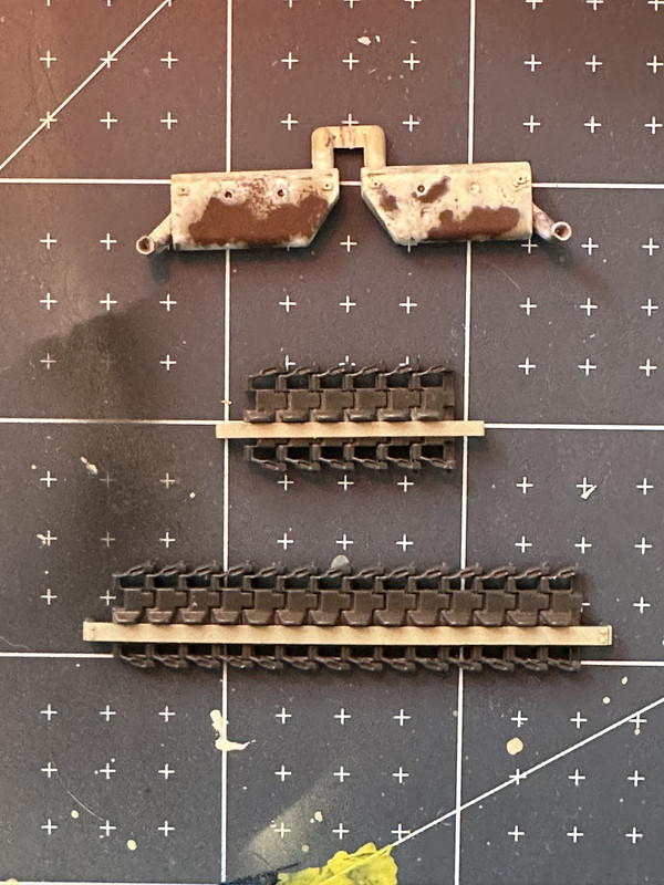 I don’t know if I want to do the markings straight away, or paint all the tools, and attach the wheels and tracks beforehand. I’m thinking not, insofar as the wheels and tracks go at least. The wheels are good to go, but I want to hit the lower hull with washes and pigments and it’d be nice if the wheels weren’t in the way.