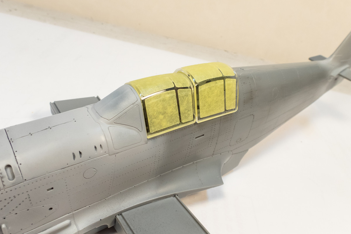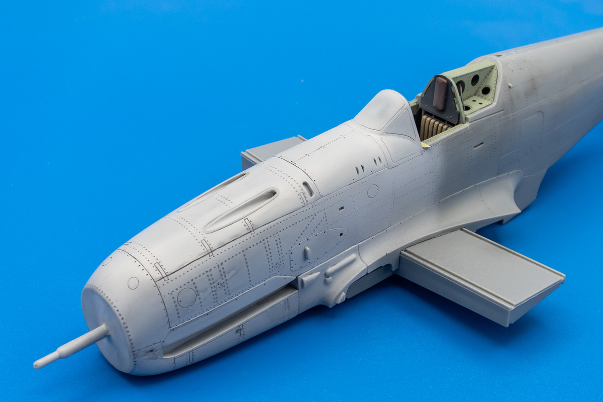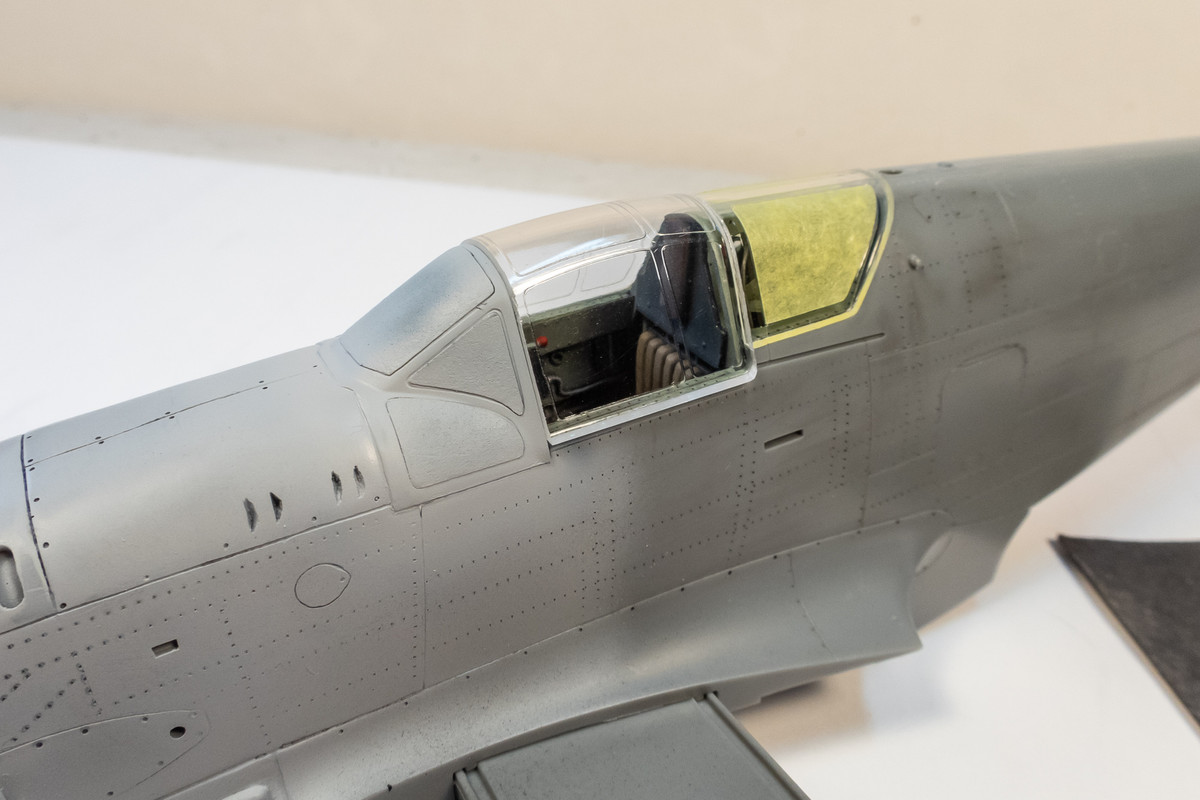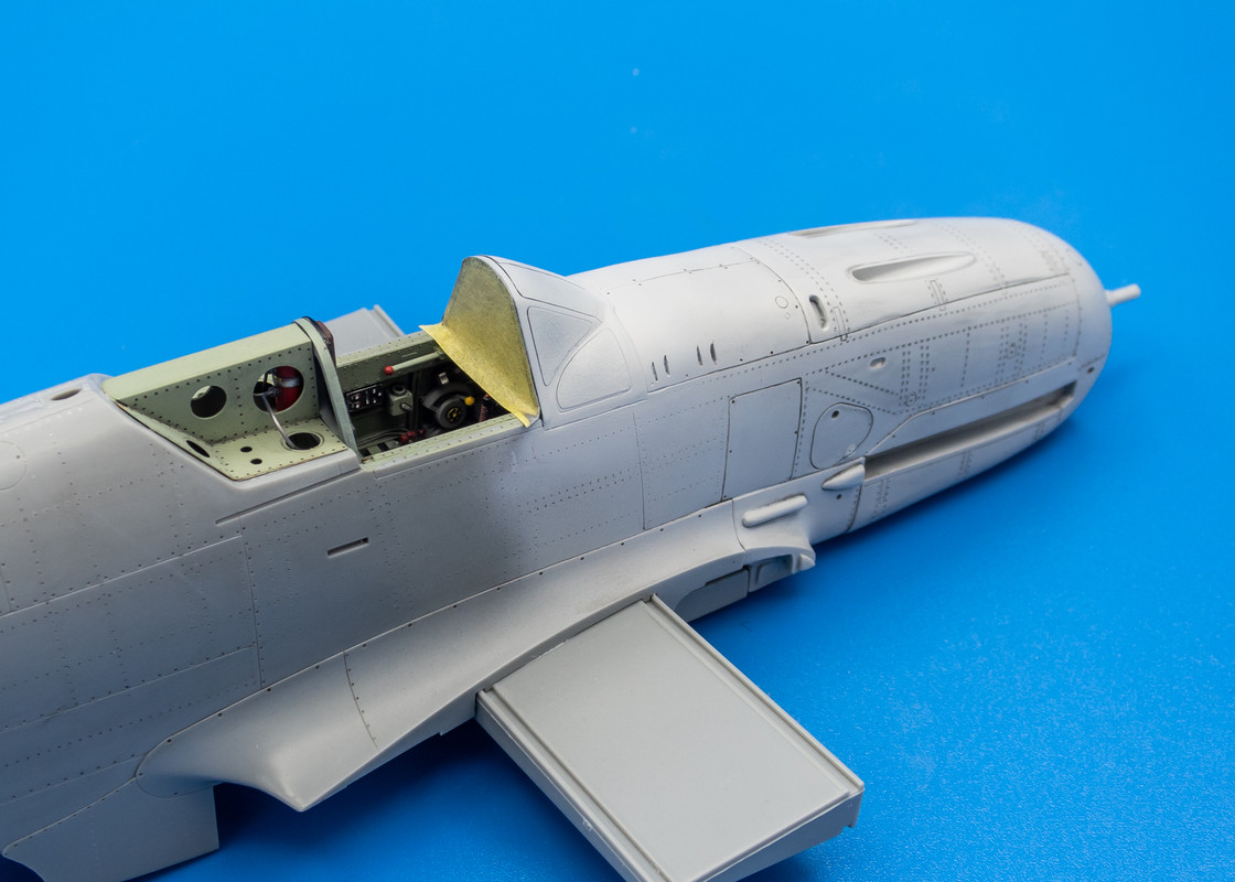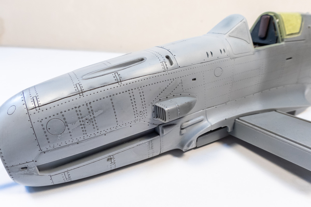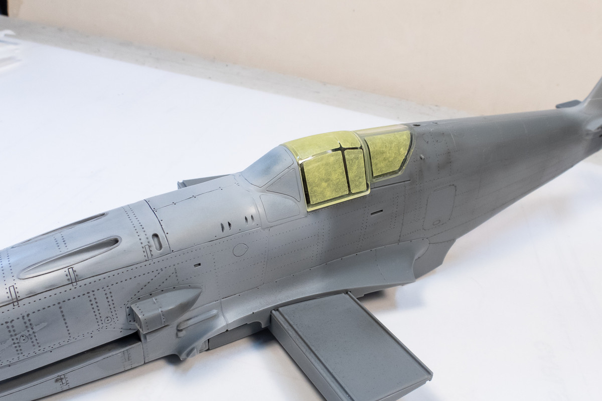 The obvious gaps were filled in with White Milliput. After the windscreen/fuselage joint was cleaned up, the area was sealed with Mr Primer Surfacer 1000.