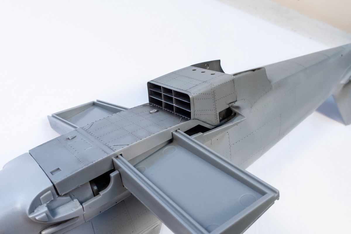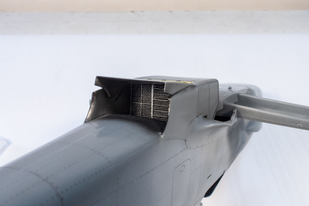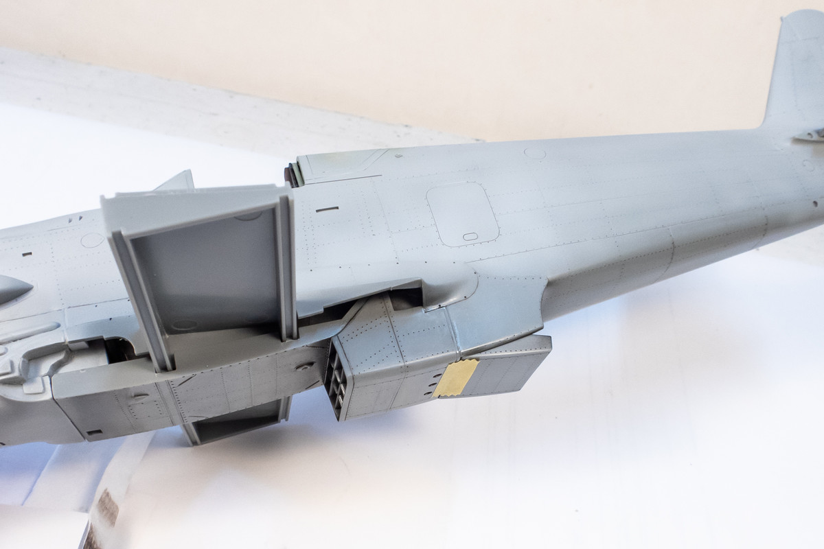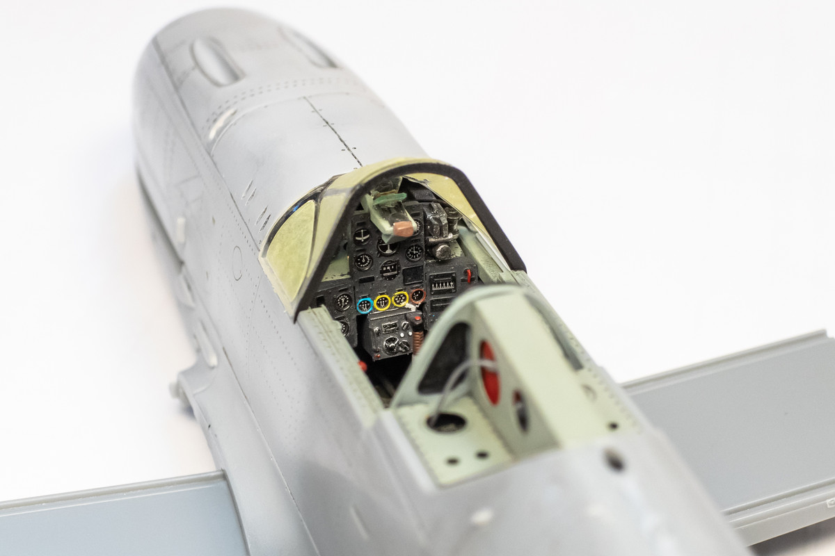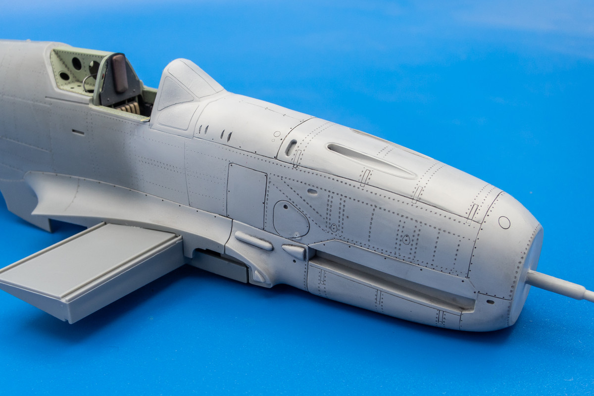 The obvious gaps were filled in with White Milliput. After the windscreen/fuselage joint was cleaned up, the area was sealed with Mr Primer Surfacer 1000.