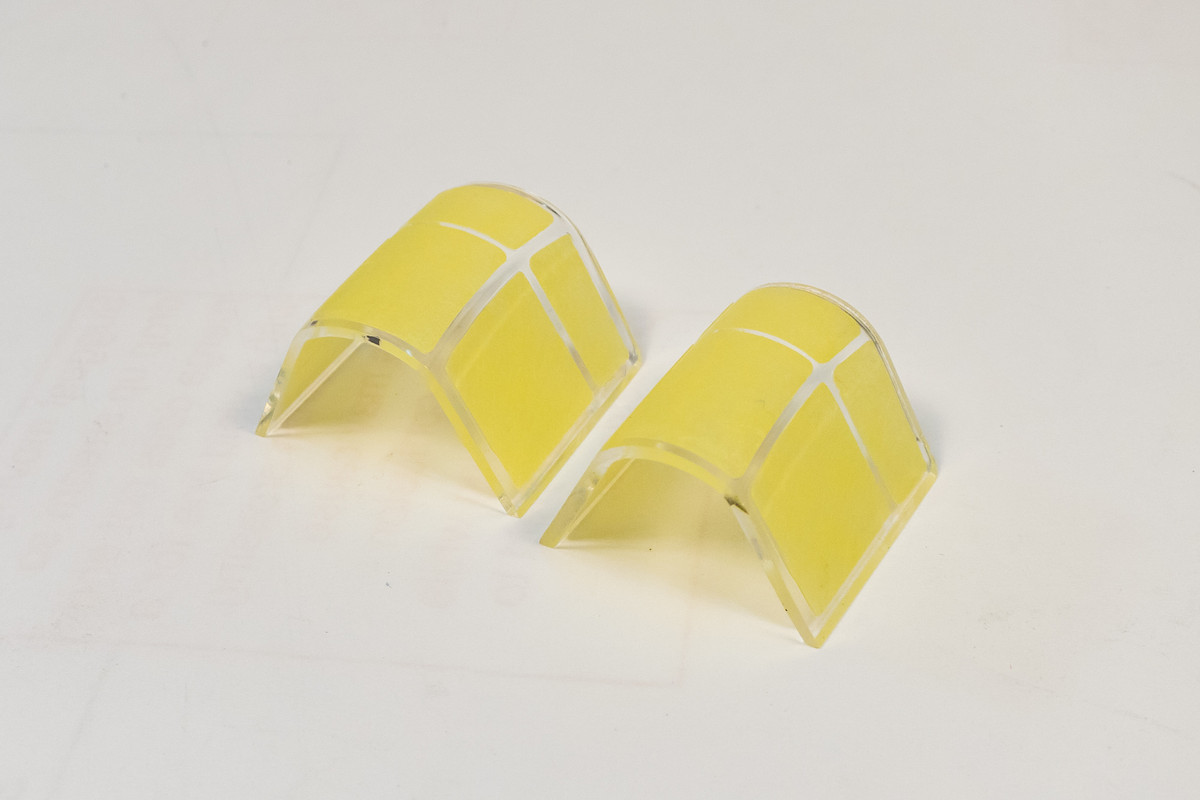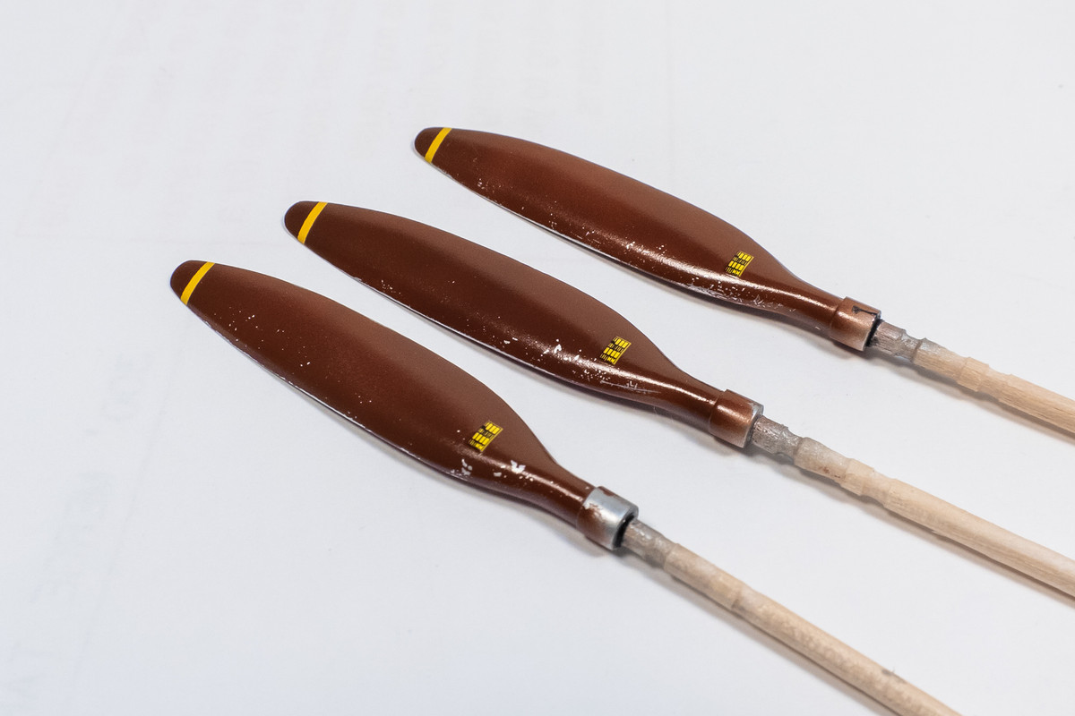 The prop blades and spinner components were given a base coat of Tamiya AS-12 Silver (decanted into the airbrush). Hairspray was applied over the silver before the brown color (2:1 mix of Tamiya XF-79 Deck Brown and Tamiya XF-7 Flat Red). Rubbing a stiff paint brush moistened with water will disrupt the hairspray layer and create a chipping effect. The chipping effects were sealed with a gloss coat (Alclad Aqua Gloss). The yellow stripes near the prop tips were masked and painted. The yellow data plates are decals from the Wolfpack Flying Swallows Part 2 decal sheet.